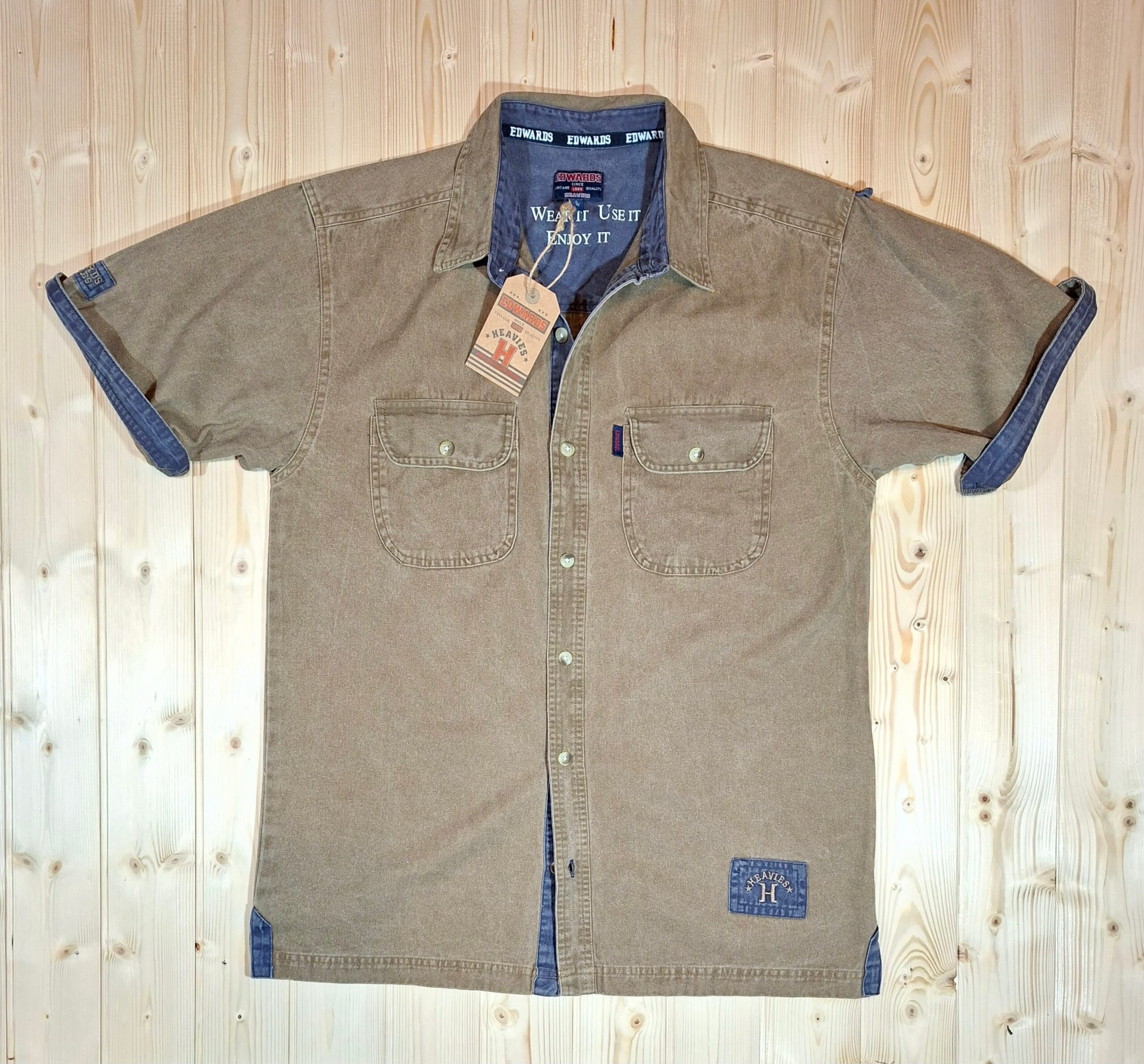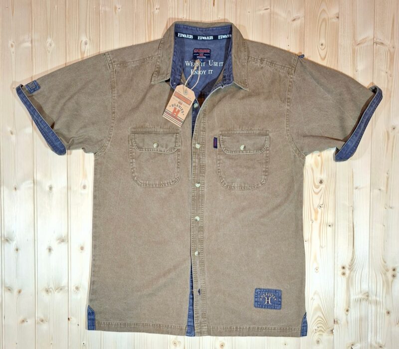 ‘Edwards Heavies’ stone washed, short sleeve, cotton twill shirt with double breast pockets, contrasting colour placket, reverse cuffs and detail. Great worn as an overshirt!! Wear it!… Wash it!… Use it!… ENJOY IT!!!